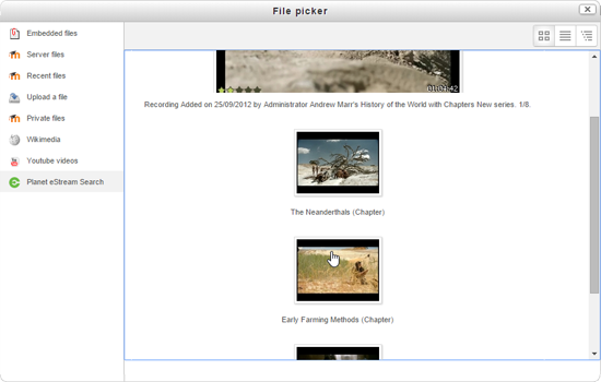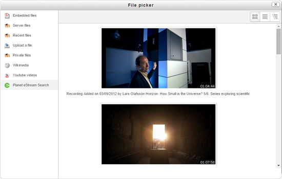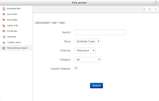 Within the File picker, click the Planet eStream Search link. You will be presented with a search box and options,